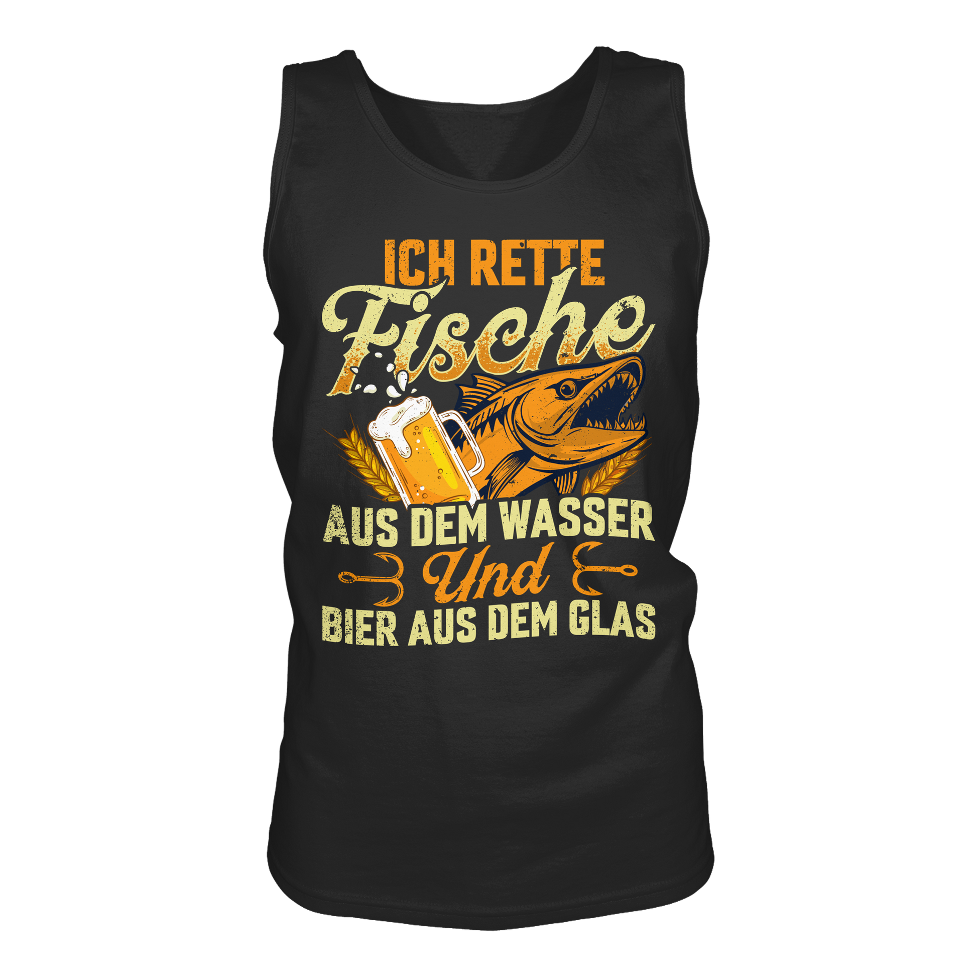 Erlebe das Gefühl der Freiheit mit unserem einzigartigen Tank-Top. Das Design kombiniert ein kraftvolles Fischmotiv mit einem Bierkrug, um Abenteuer und Entspannung zu symbolisieren.